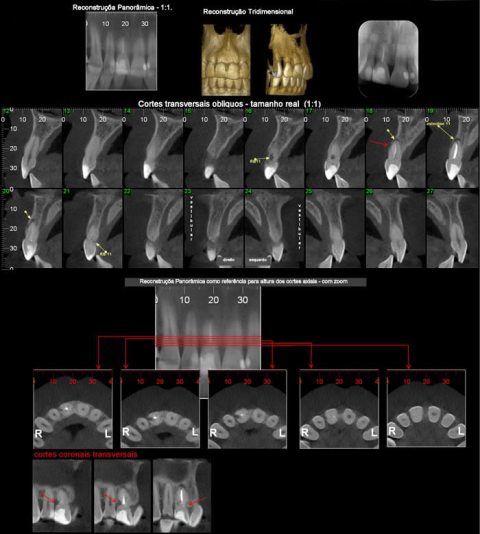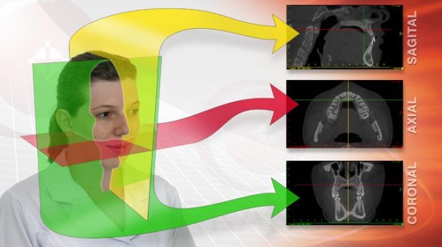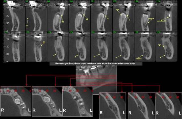 Nos softwares há ferramentas que permitem a reconstrução e a obtenção de novos cortes que mostram imagens de uso pontual na odontologia como os cortes transversais e longitudinais.