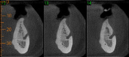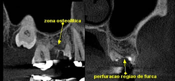 Achado radiográfico, na radiografia periapical de rotina, nota-se área de menor densidade na distal cervical e alteração no contorno na mesial, e rarefação óssea periapical. Ao exame tomográfico pode-se observar o dente 11 com osteólise apical e área de reabsorção na distal e reabsorção por substituição na mesial.