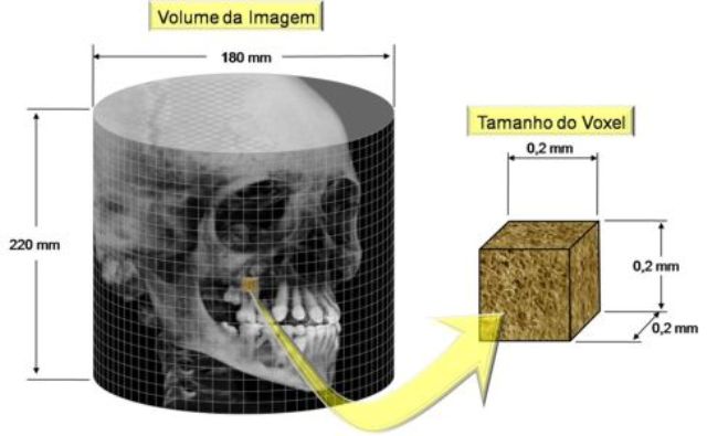 As imagens digitais são formadas por pequenos pontos, a menor unidade destas, que são pequenos quadrados com medidas laterais idênticas, largura (x) e altura (y), sendo chamado de pixel. Como a tomografia é um volume tridimensional, um novo plano é adicionado, a profundidade (z), constituindo então não mais um quadrado e sim um cubo, chamado de voxel (Figura abaixo). A tomografia cone beam possui voxel isométrico (voxel com altura, largura e profundidade de iguais dimensões) e voxel isomorfo, aumentando a capacidade de reproduzir detalhes dos tecidos duros com maior nitidez e clareza do que as tomografias médicas (que não possuem voxels isométricos), especialmente de estruturas delicadas, como por exemplo, lâmina dura. Teoricamente quanto menor o tamanho do voxel, mais nítida tende ser a imagem, mas outros fatores como a qualidade do sensor, projeto do aparelho, estabilidade do paciente e software interferem na nitidez final.