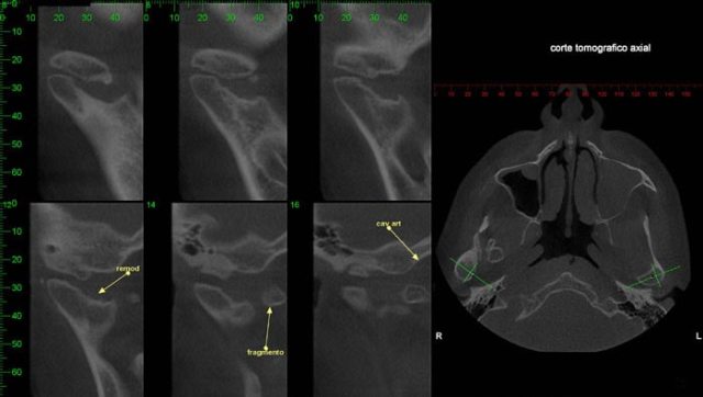 Paciente com história clínica de trauma. Fratura no côndilo direito com deslocamento do fragmento para medial e deslogamento do côndilo para lateral da cavidade articular.